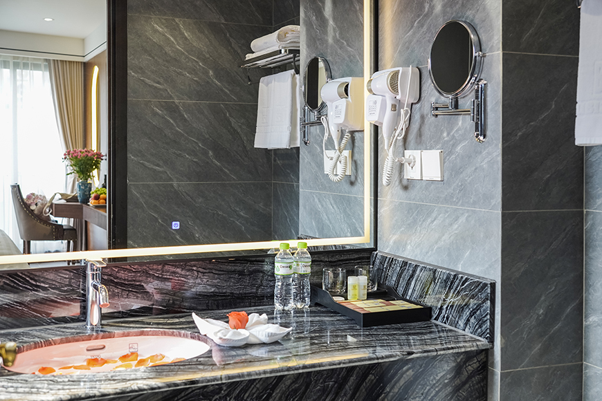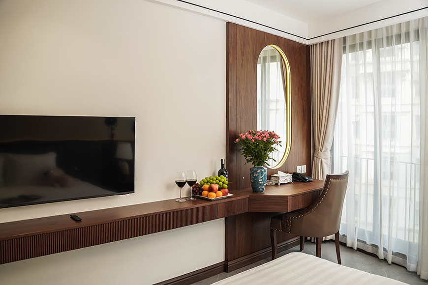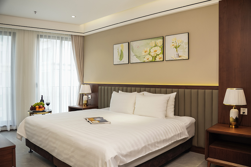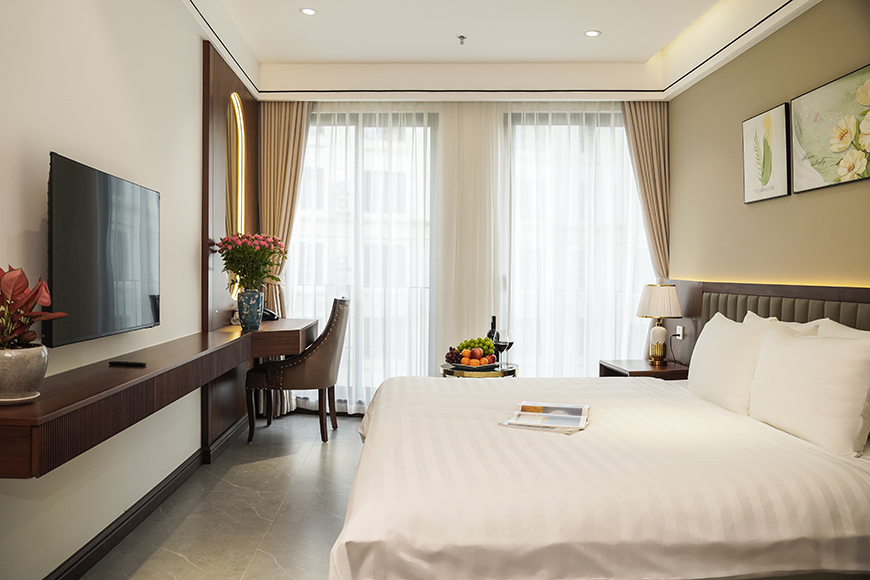 Phòng sử dụng cửa kính lớn hướng ra thành phố, giúp tận dụng tối đa ánh sáng tự nhiên và mở rộng tầm nhìn, tạo cảm giác thoáng đãng và hiện đại. Nội thất được sắp xếp khoa học, đáp ứng đầy đủ nhu cầu nghỉ ngơi, làm việc và thư giãn của khách hàng.